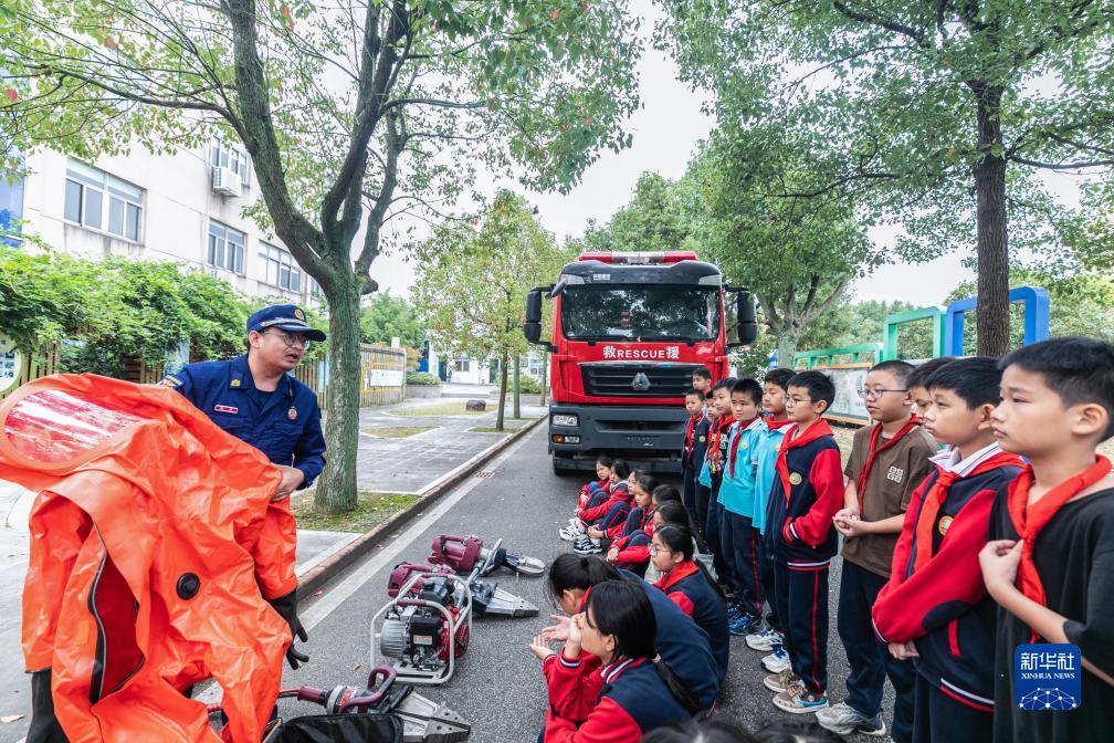 10月13日,浙江省湖州市吴兴区东林镇应急管理服务中心联合东林小学开展“国际减灾日”主题活动,应急救援队员给学生展示应急救援工具。