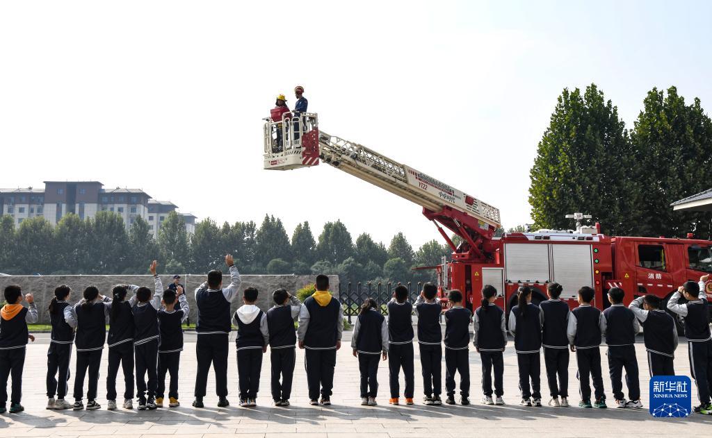 10月13日,在河南省济源市延庆外国语学校,一名学生在消防员陪伴下乘云梯体验高空救援。