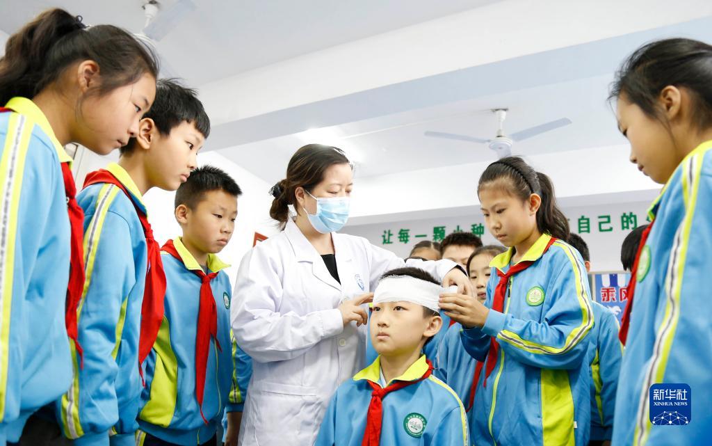 10月13日,在河北省邢台市家乐园小学,学生在医护人员指导下学习紧急救护知识。
