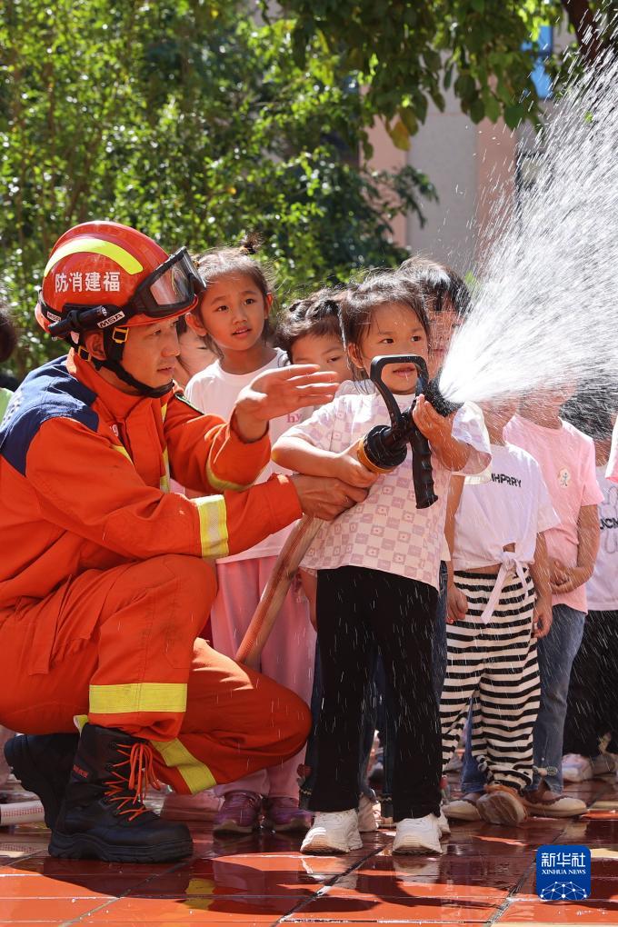 10月13日,在福建省厦门市同安区天骄幼儿园,同安区消防救援大队消防员指导孩子们使用水枪“灭火”。