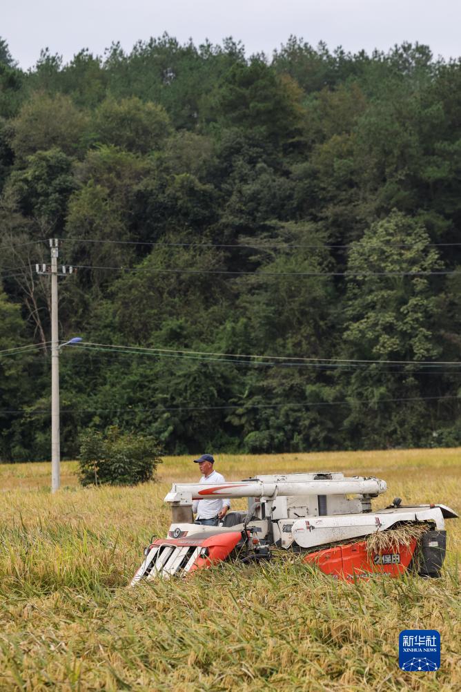 10月13日,在杭州临安太阳镇的杭州临安元生粮油专业合作社生态稻田内,种植户用收割机收割生态水稻。