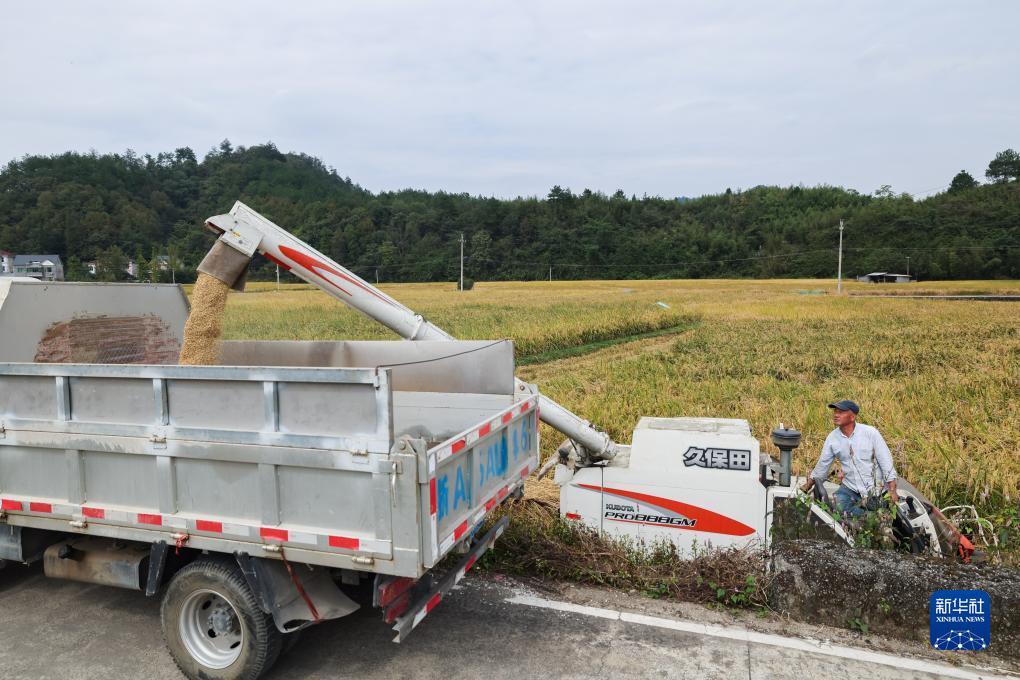 10月13日,在杭州临安太阳镇的杭州临安元生粮油专业合作社生态稻田内,种植户把收获的生态稻谷装车。