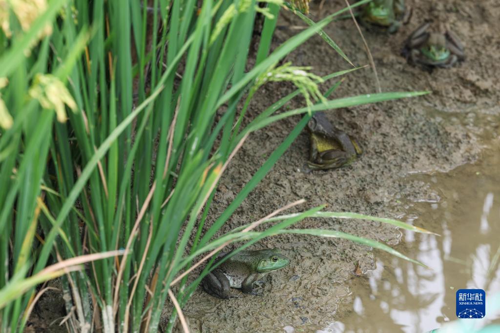 这是10月13日在杭州临安太阳镇的杭州佳稷农业生态稻米种植基地拍摄的稻田里套养的牛蛙,套养能让每亩增收2000至3000元。