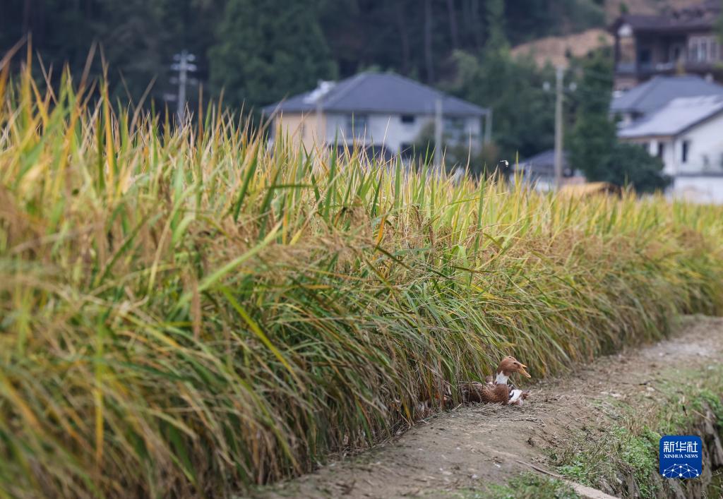 这是10月13日在杭州临安太阳镇杭州临安元生粮油专业合作社生态稻田内拍摄的散养着的鸭子。