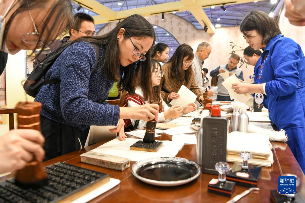 10月13日,在位于成都市世纪城新国际会展中心的2023天府书展主展场,市民在体验印刷技艺。