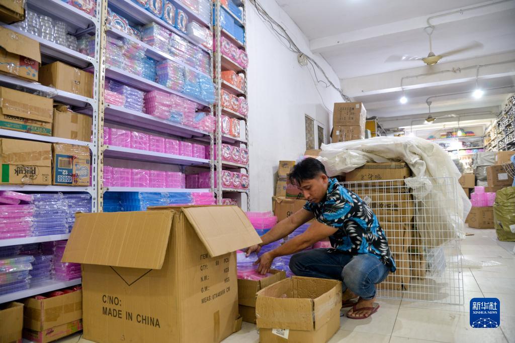 在印度尼西亚雅加达一家小商品批发店,员工整理从中国宁波舟山港运送至印尼雅加达丹戎不碌港的货物(10月13日摄)。