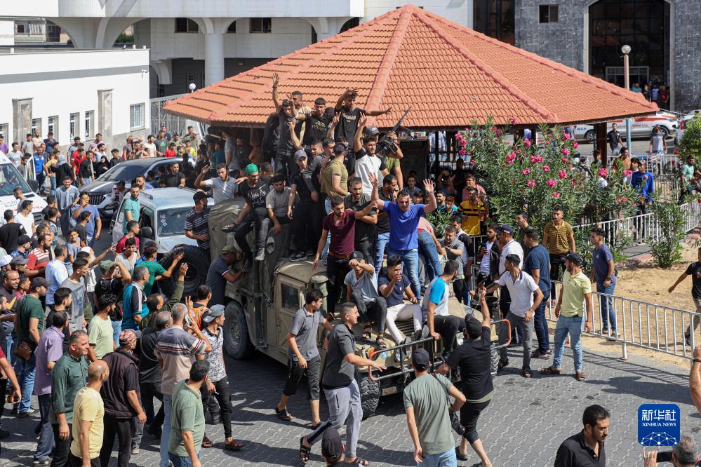 10月7日,在加沙城,巴勒斯坦人登上一辆以色列军用车辆。