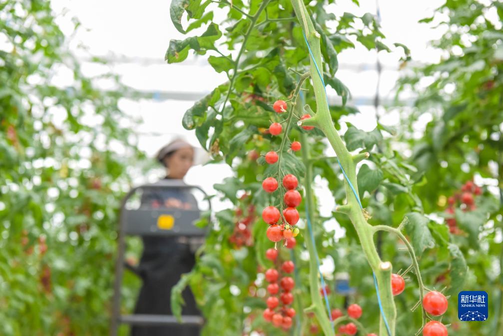 10月13日,在理塘县玛吉阿米花园农庄的智慧农业无土栽培馆,当地藏族群众采摘红色小番茄。