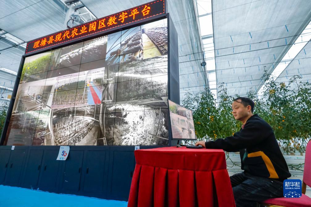 10月13日,理塘县玛吉阿米花园农庄负责人丁义通过理塘县现代农业园区数字平台查看农庄不同区域的运转情况。