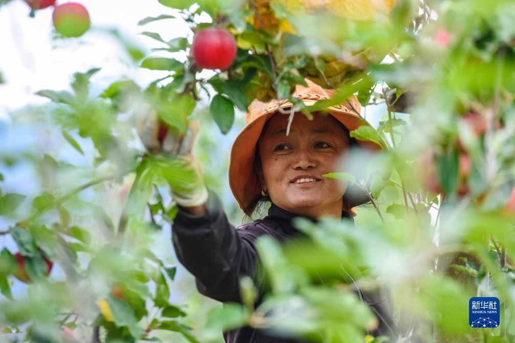 10月13日,在乡城县“苹果+藏猪”种养循环现代农业园区内的有机苹果种植示范基地,当地藏族群众采摘苹果。