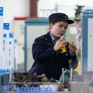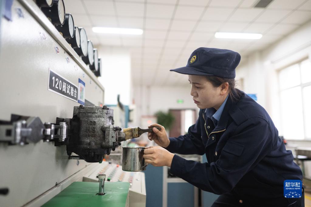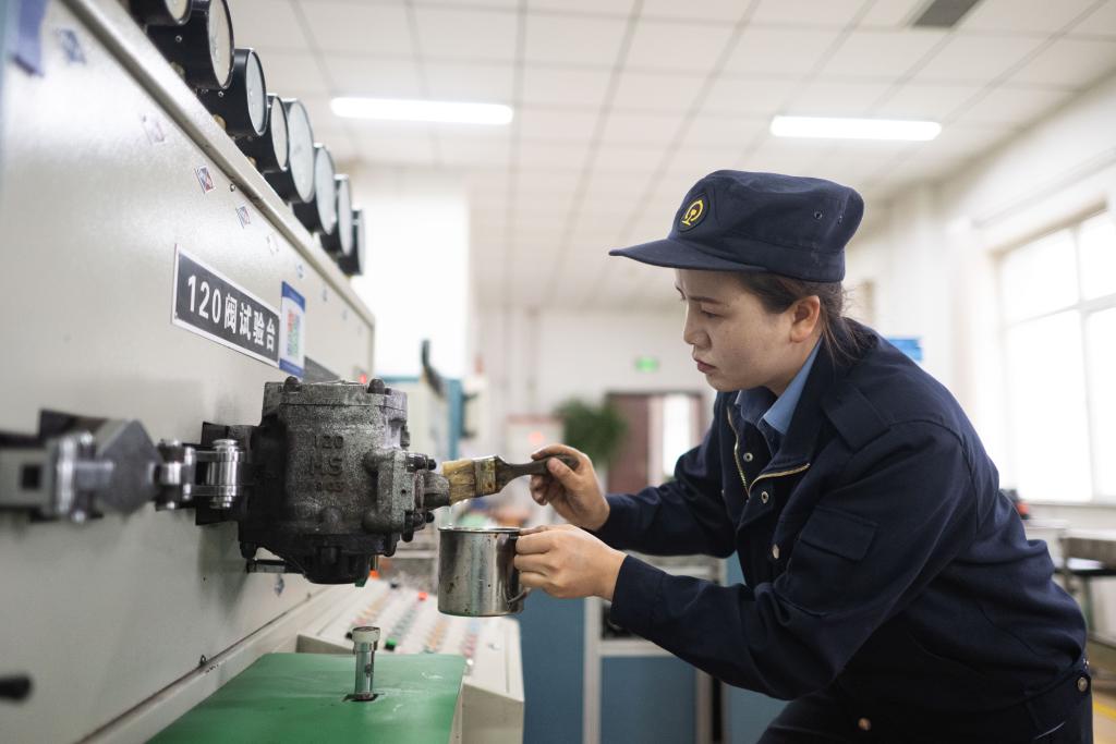 10月12日,在中国铁路青藏集团有限公司西宁东车辆段制动班组,马婷在120阀试验时涂抹检漏剂。
