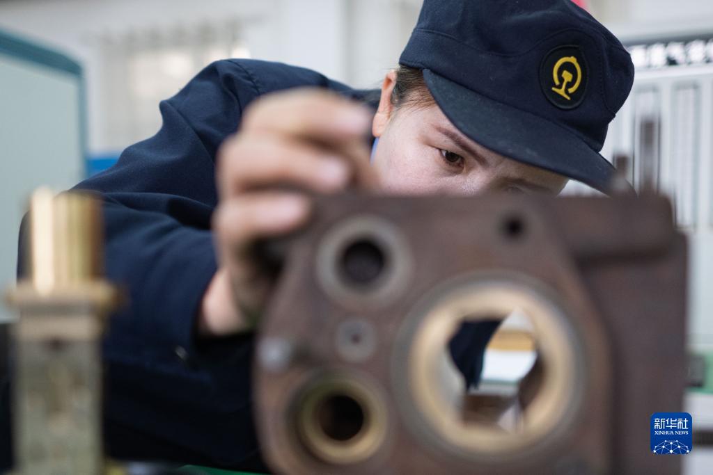10月12日,在中国铁路青藏集团有限公司西宁东车辆段制动班组,马婷在检查120阀主阀内腔。