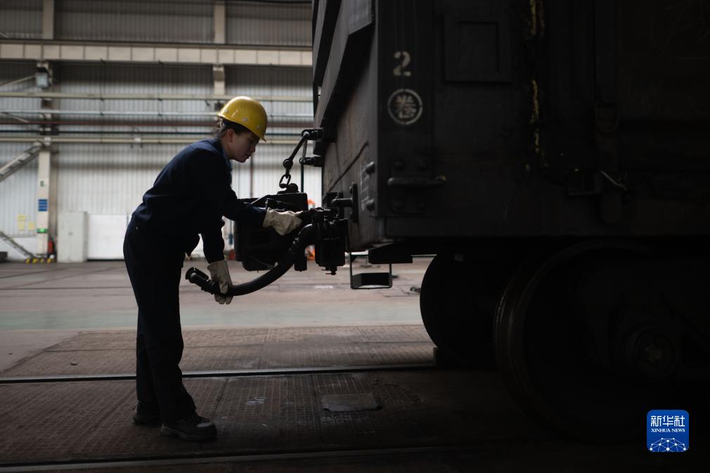 10月12日,在中国铁路青藏集团有限公司西宁东车辆段制动班组,马婷在检查货车车辆制动软管。