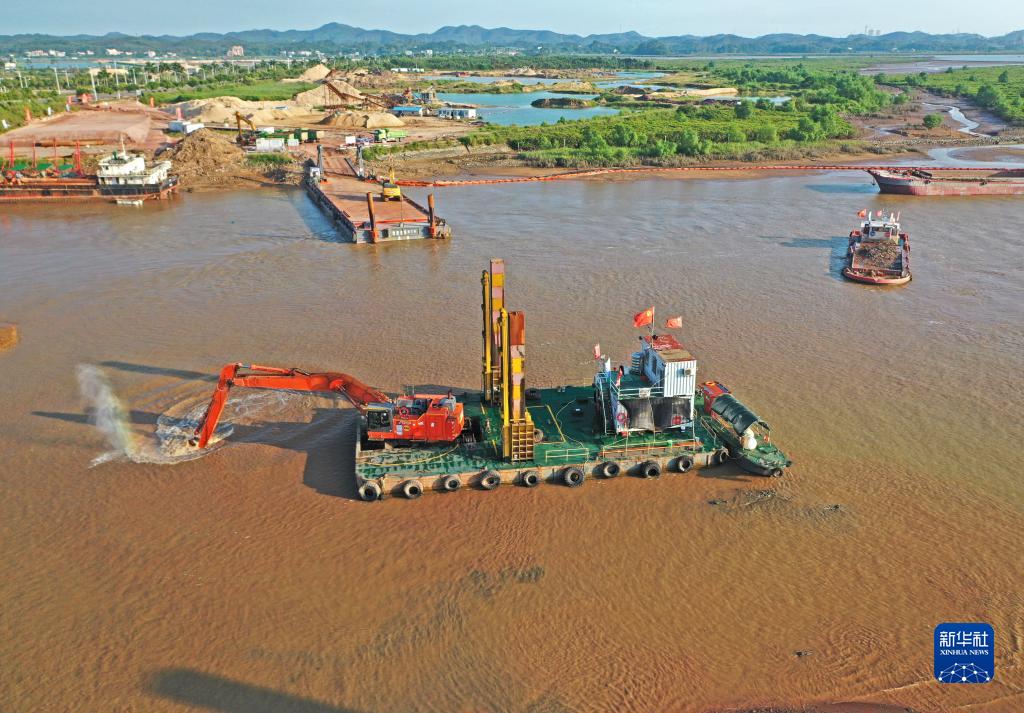 施工机械在平陆运河入海口段进行疏浚作业(10月3日摄,无人机照片)。
