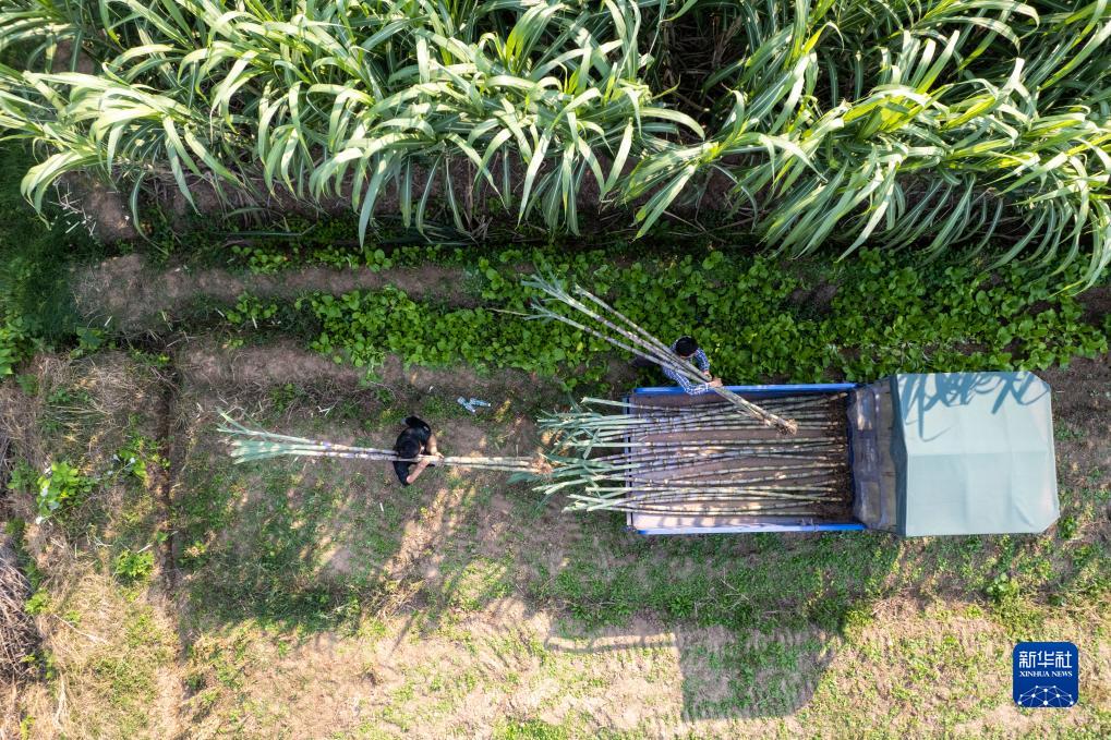 10月14日,在南县乌嘴乡港口村,村民把采收的甘蔗搬运上车(无人机照片)。