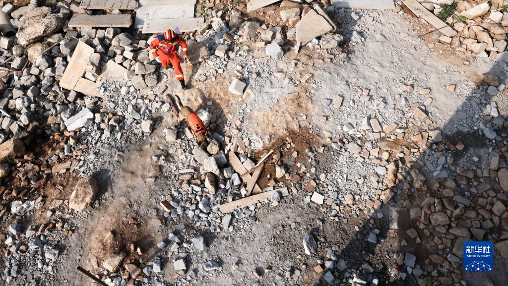 10月14日,参赛训导员和搜救犬在进行废墟搜救。