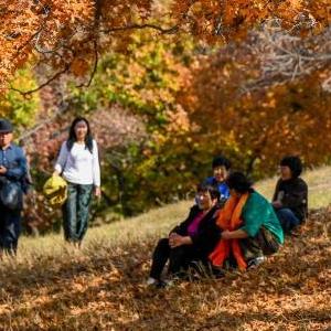 10月14日,游人在乌旦塔拉五角枫森林公园游览。