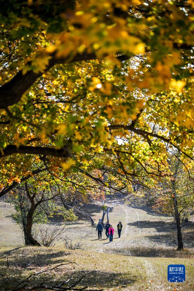 10月14日,游人在乌旦塔拉五角枫森林公园游览。