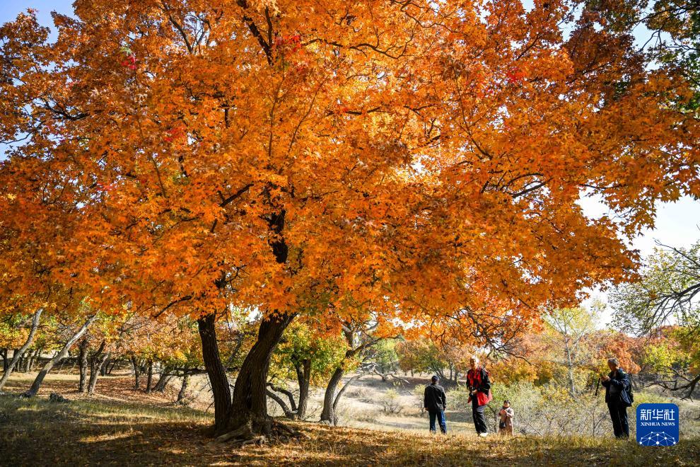 10月14日,游人在乌旦塔拉五角枫森林公园游览。