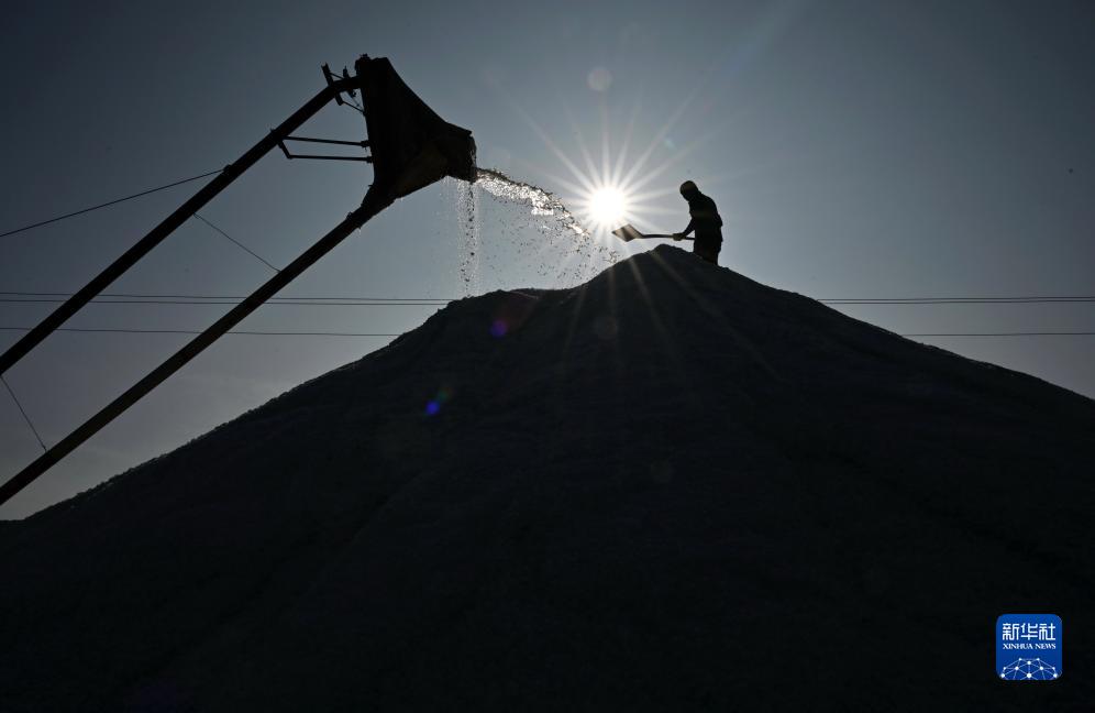 10月14日,工人在河北省滦南县嘴东经济开发区盐场收获秋盐。