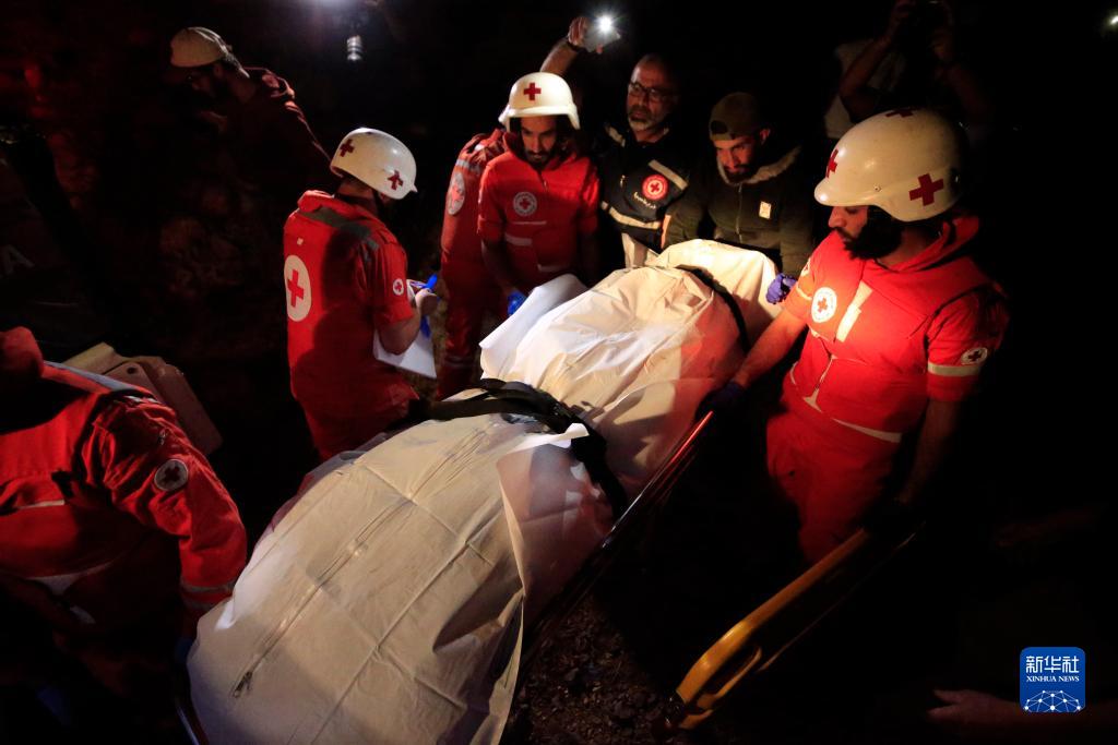 10月14日,在黎巴嫩南部萨巴阿镇,救护人员运送遭以军炮击身亡的一名老妇人的遗体。