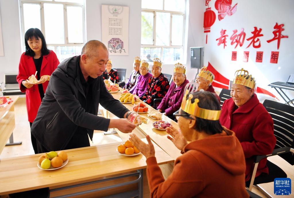 10月14日,河北省康保县土城子镇互助幸福院的工作人员为过集体生日的老人们端上生日蛋糕。