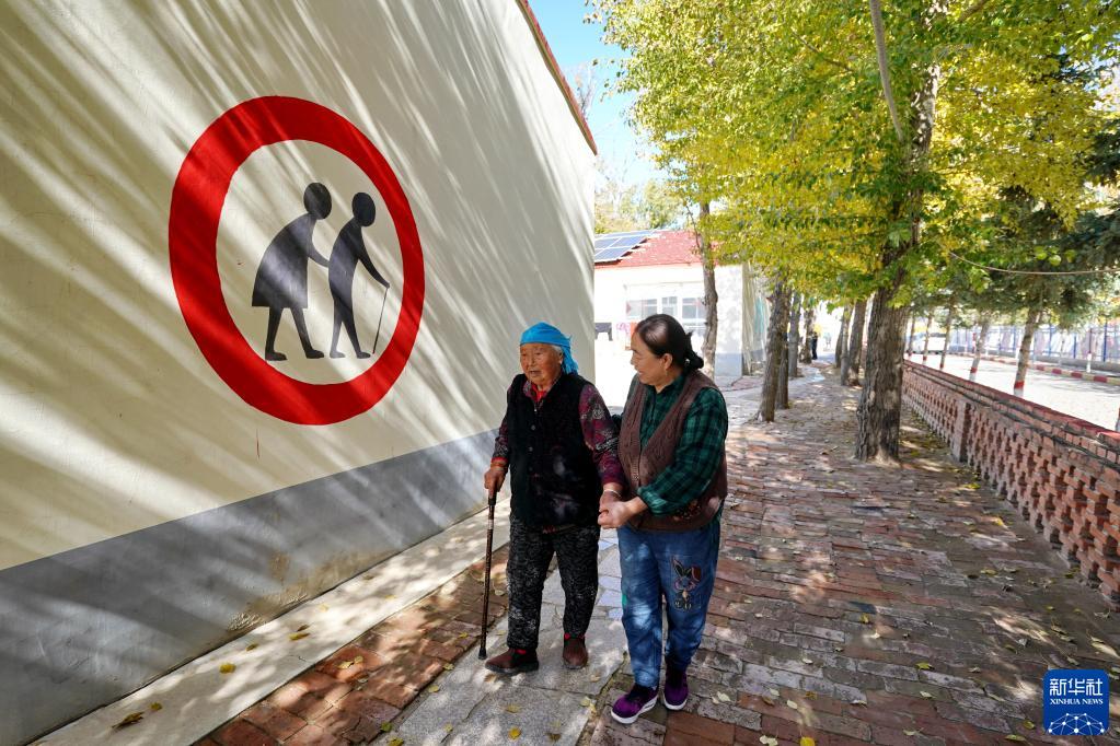 10月14日,居住在河北省康保县土城子镇互助幸福院的老人在院子里行走。