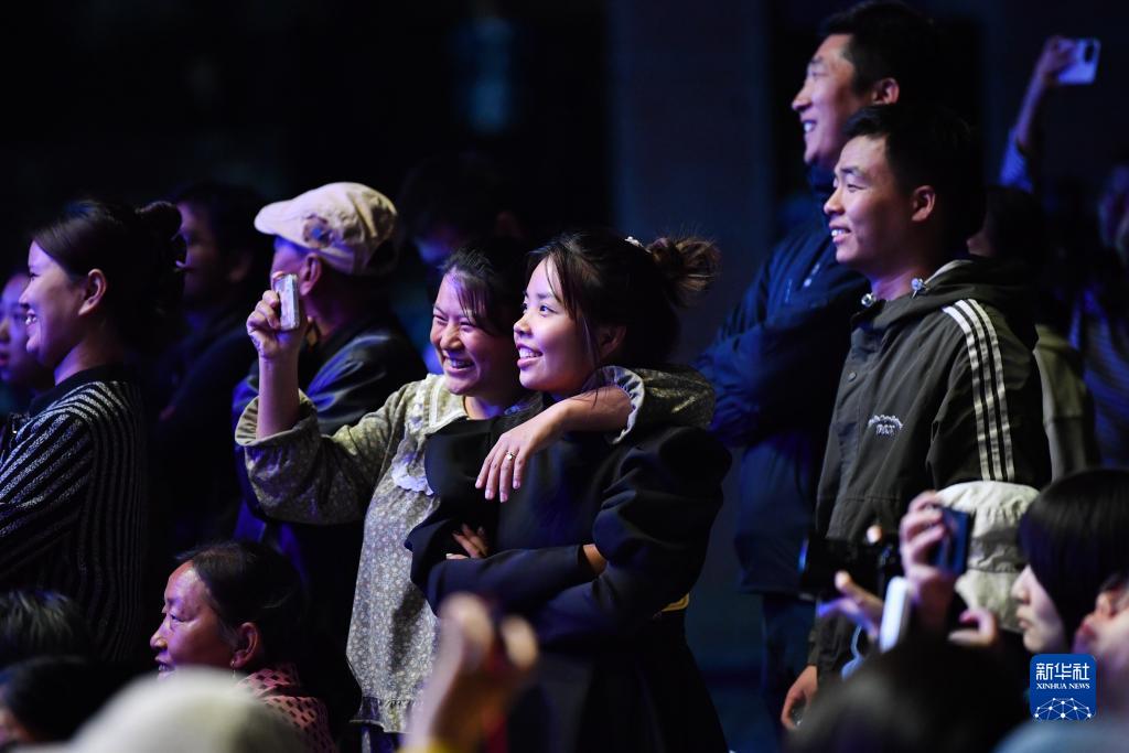 10月14日,村民和游客在大南坡村内广场观看演出。