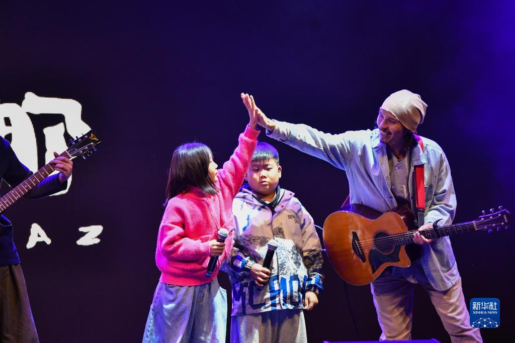 10月14日,大南坡小学学生王艺可(左一)与参演乐手在表演后击掌。