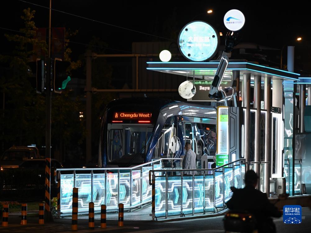 10月13日,在成都市郫都区,一辆2023成都世界科幻大会主题电车驶入车站。