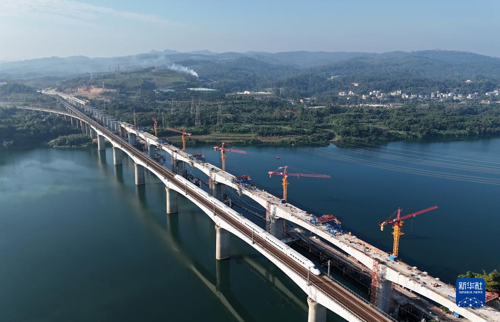 10月15日,一列动车组列车从合龙后的湘桂铁路柳江双线特大桥旁驶过(无人机照片)。