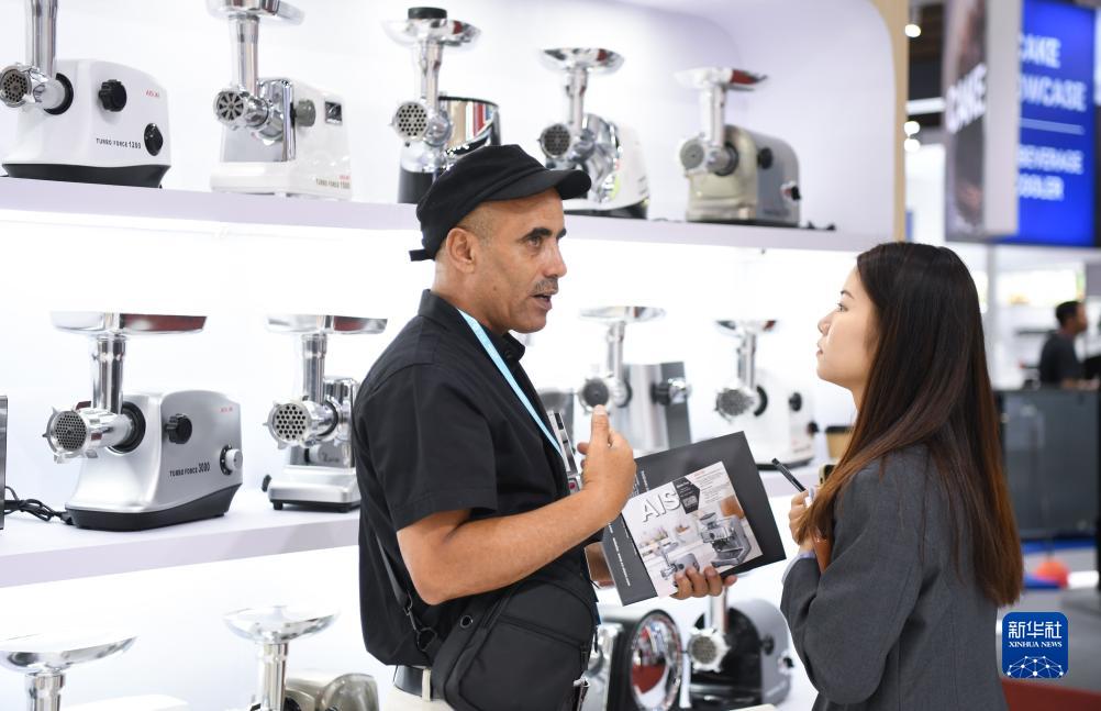 10月15日,一名外国采购商在一家小家电展台洽谈业务。