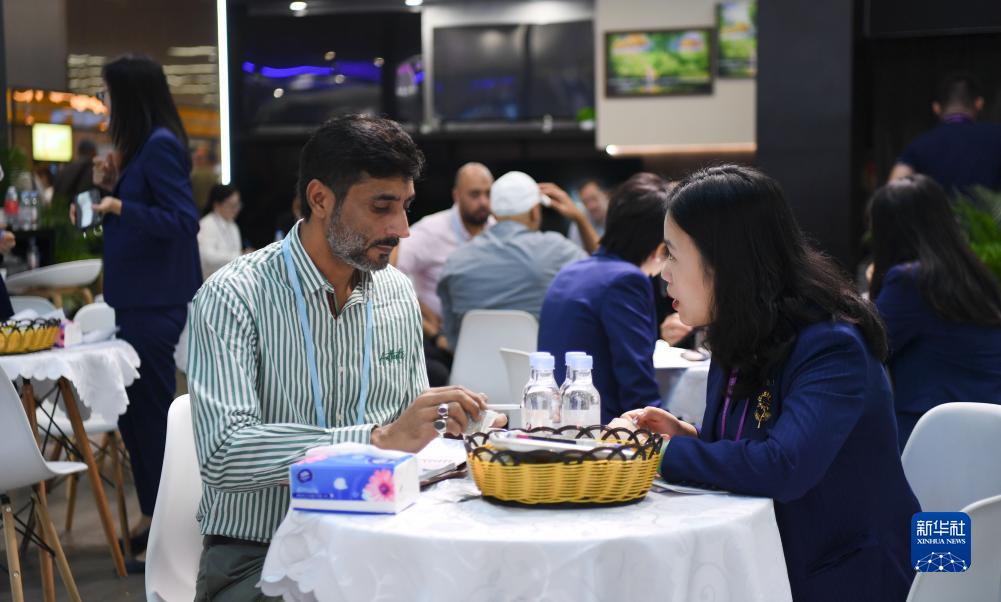 10月15日,在一家液晶电视展台,外国采购商在洽谈业务。