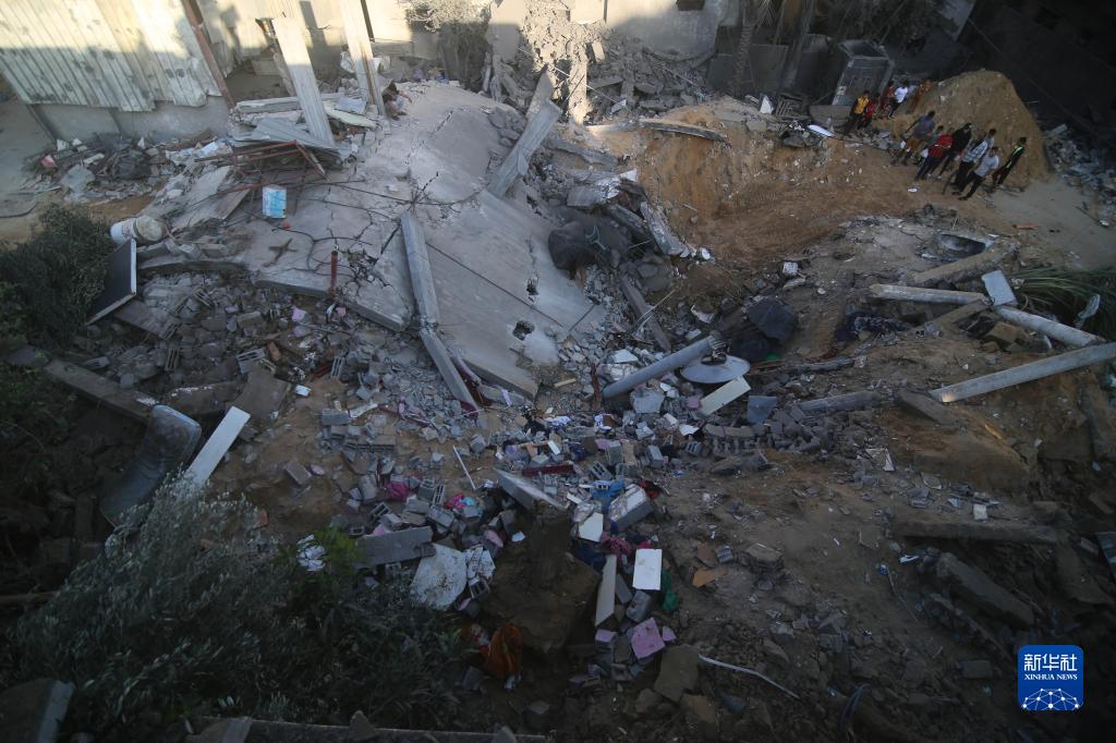 10月15日,在加沙地带南部城市拉法,人们查看遭以色列空袭后的受损建筑。