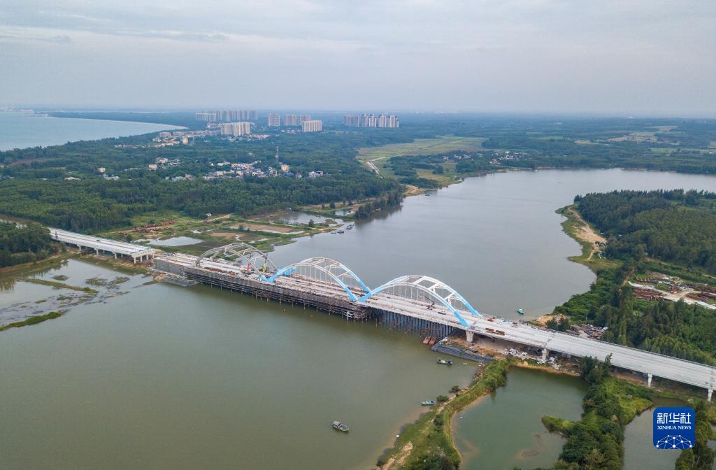 海南环岛旅游公路是建设海南自贸港和创建国际旅游消费中心的先导性重大基础设施项目,该公路主线总里程988.2公里,串联沿途特色海湾、海角、特色小镇和旅游景区、滨海度假区等。海南环岛旅游公路临高段全长约58公里,目前主线路基段已建设完成,工人们正在对文澜江大桥进行桥面铺装、护栏、拱肋面漆喷涂等施工。