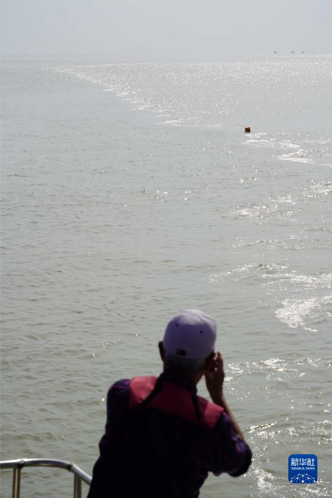 10月12日,在黄河入海口,游客在船上拍摄黄河与渤海交汇。