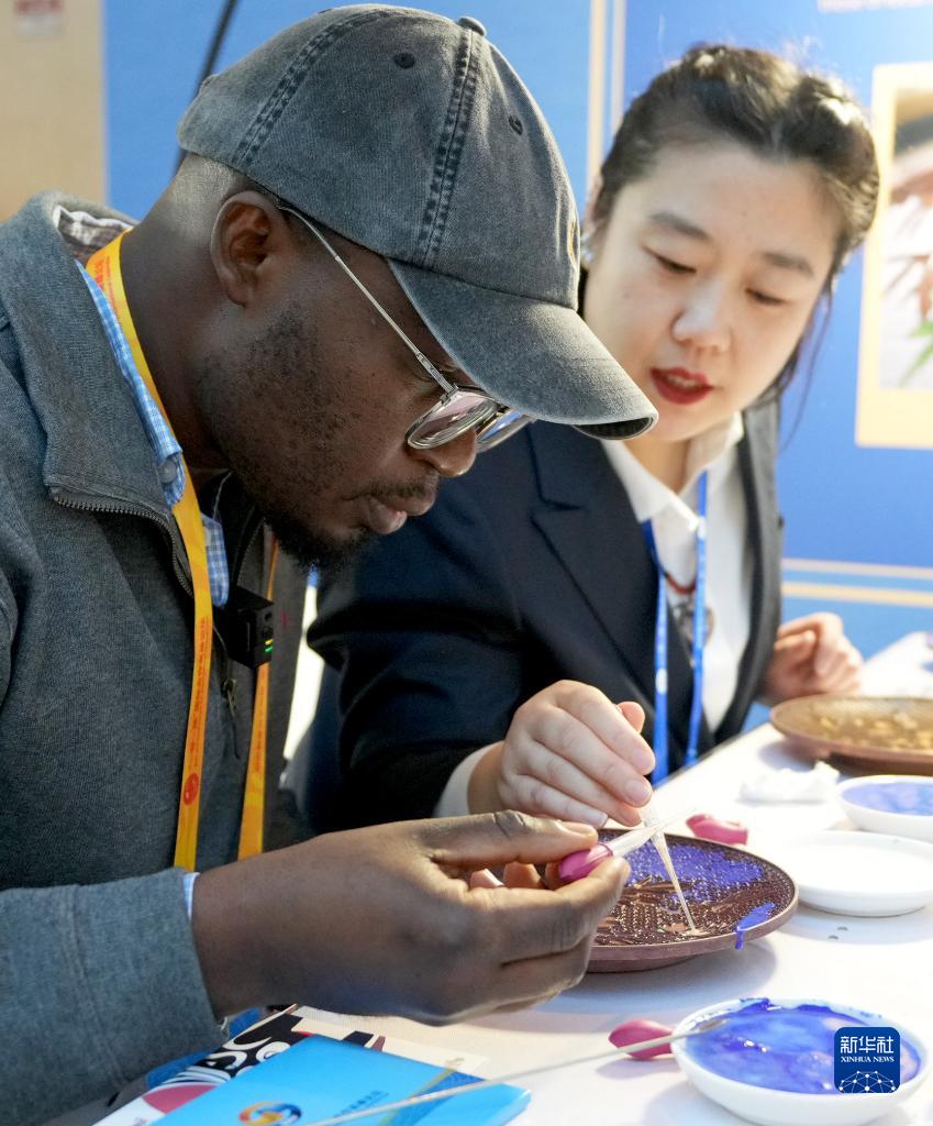 10月16日,在第三届“一带一路”国际合作高峰论坛新闻中心,一名外国记者体验景泰蓝制作技艺。