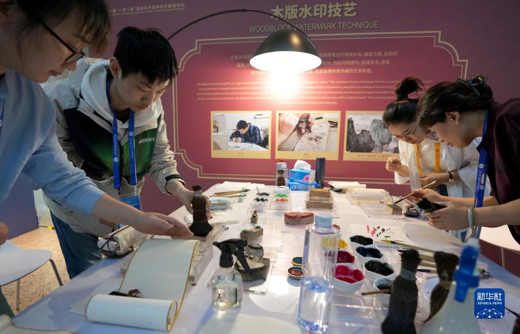 10月16日,在第三届“一带一路”国际合作高峰论坛新闻中心,媒体记者体验木版水印技艺。