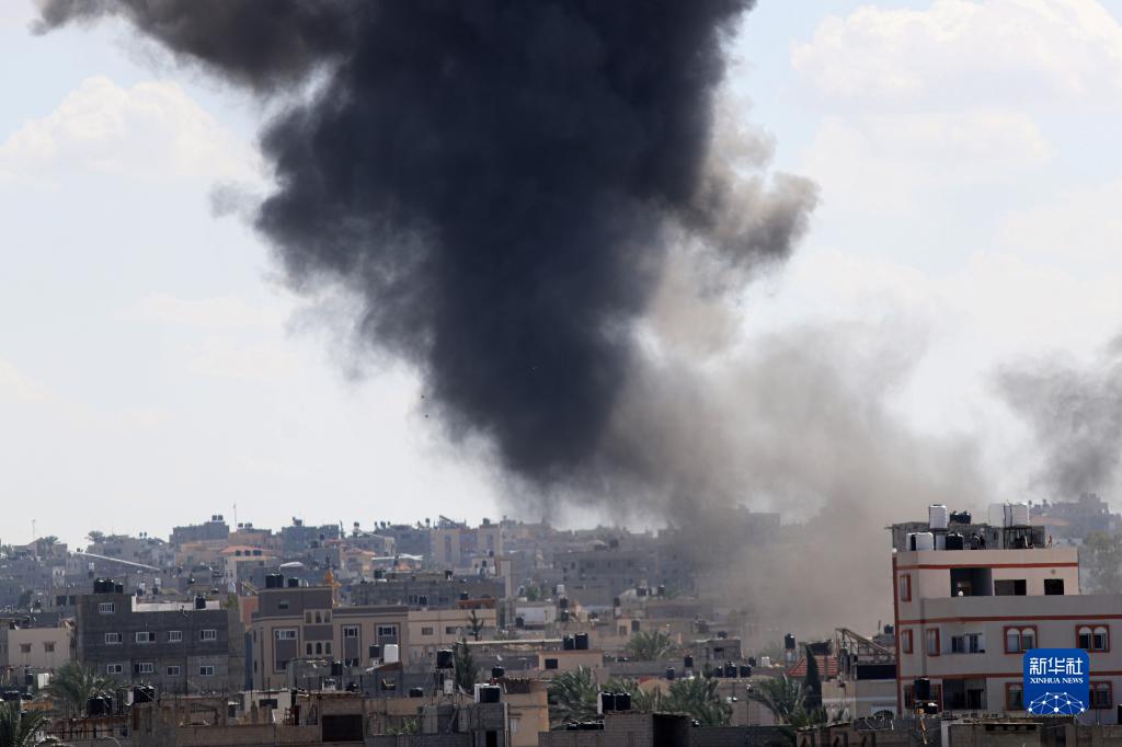 10月15日,加沙地带南部城市汗尤尼斯的建筑遭以色列军队空袭后升起浓烟。
