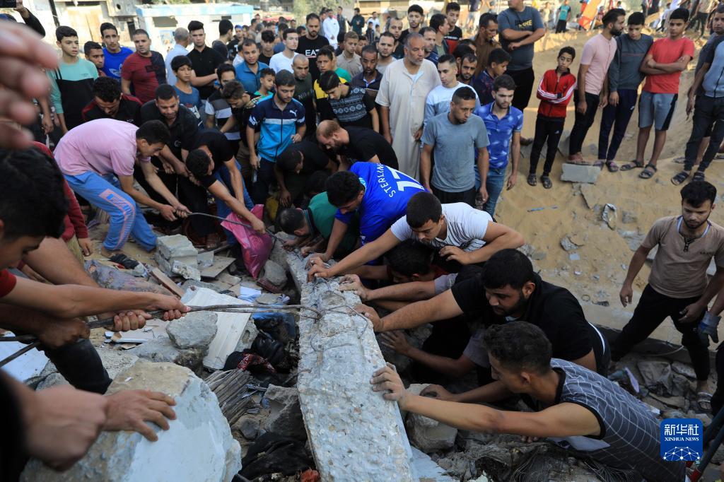 10月16日,在加沙地带南部城市汗尤尼斯,人们在遭以色列袭击后的建筑废墟中救援伤者。