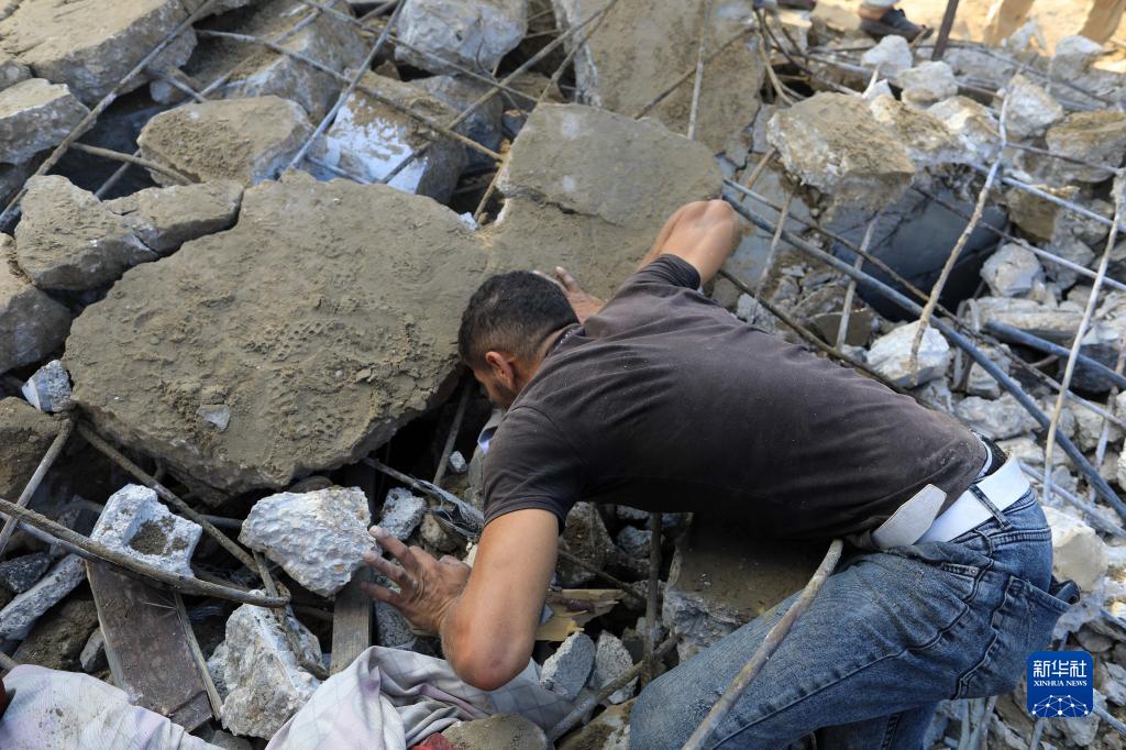 10月16日,在加沙地带南部城市汗尤尼斯,一名男子在遭以色列袭击后的建筑废墟中救援伤者。