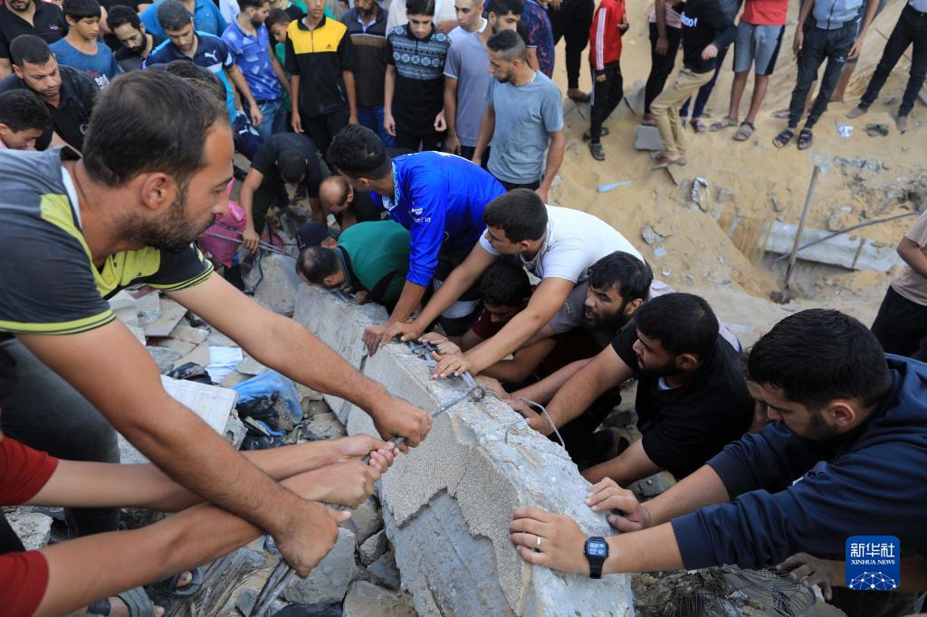 10月16日,在加沙地带南部城市汗尤尼斯,人们在遭以色列袭击后的建筑废墟中救援伤者。