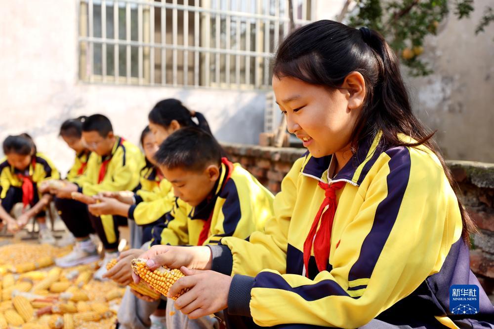 10月16日,山东省枣庄市东山阴小学学生在农家小院帮农民搓玉米。