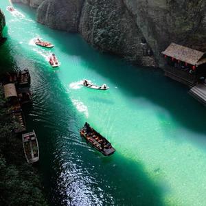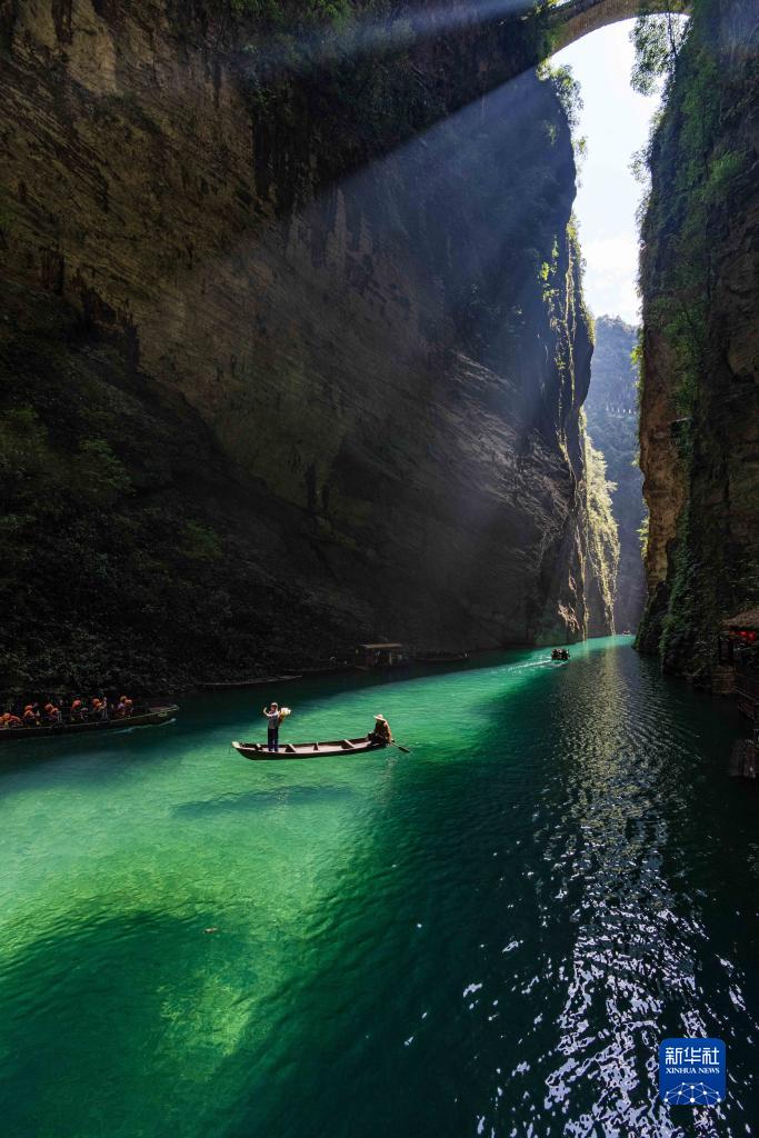 秋日,湖北省恩施土家族苗族自治州鹤峰县容美镇屏山村屏山旅游景区吸引众多游客。屏山旅游景区河水清澈见底,舟行水上如悬浮空中,美如画卷。