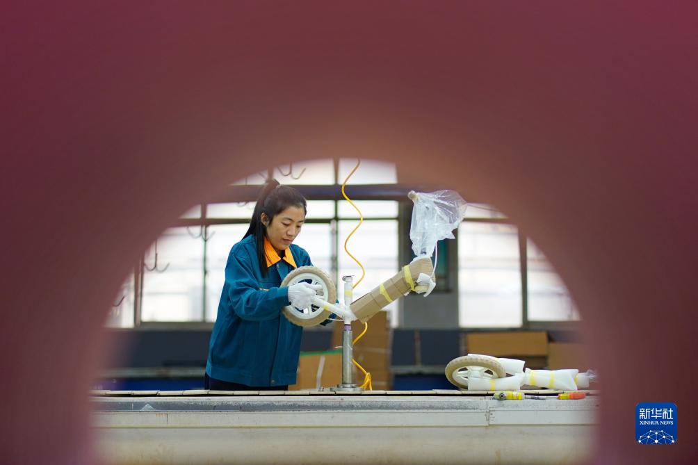 10月16日,平乡县一家童车生产企业的工人在组装童车。