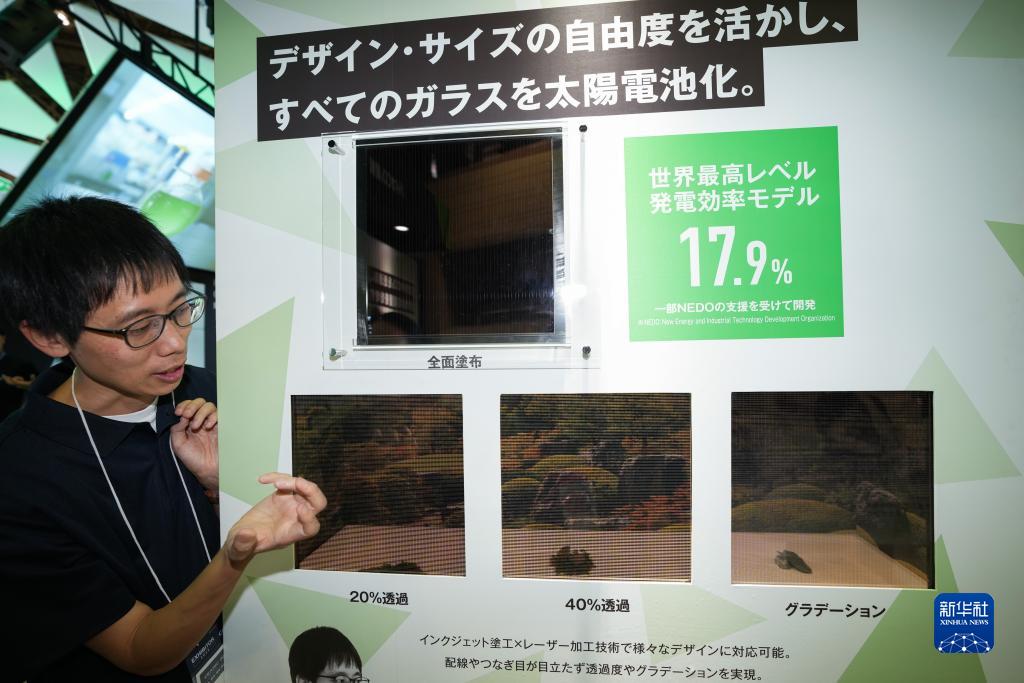 10月16日,在日本千叶举行的高新技术博览会媒体导览日上,松下展区工作人员向媒体介绍太阳能电池。