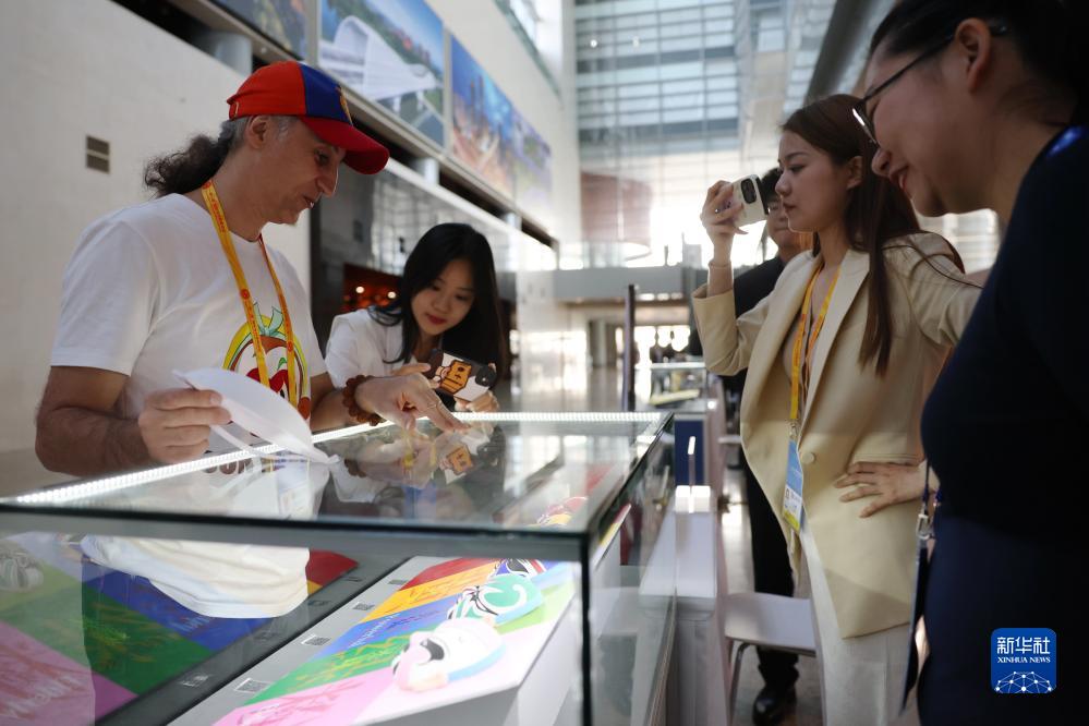 10月16日,参会记者在“一带一路”国际合作高峰论坛新闻中心参观展示的中国非物质文化遗产展品。