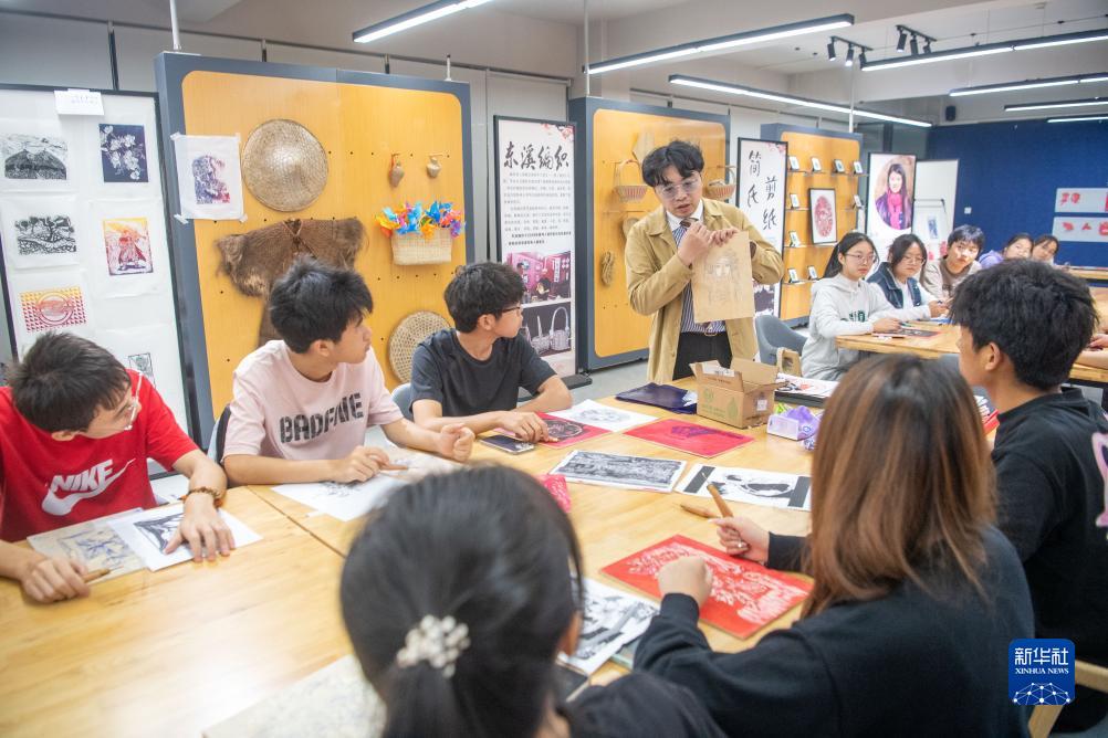 在重庆移通学院“綦河书院”的巴渝文化工作室内,老师在教授学生学习重庆市级非遗綦江农民版画的制作。