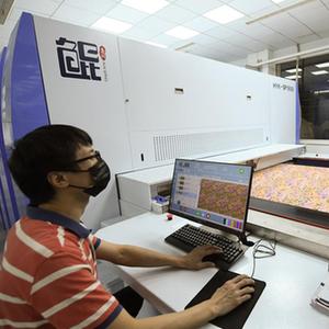 10月17日,浙江鸿大印染集团有限公司的工作人员操纵国内自主研发的数码打印机打印花样。