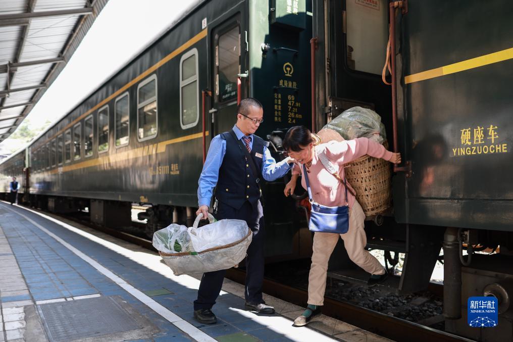 10月17日,5630次列车到达桐梓站后,村民携带农产品下车。